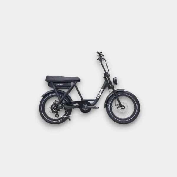 De Tomos Flexer is een zwarte fatbike met een lage instap.
